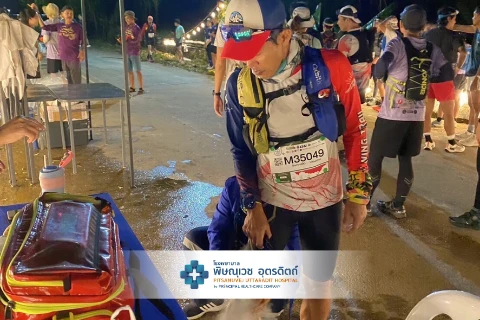 ทีมพยาบาลห้องฉุกเฉิน ร่วมกับเจ้าหน้าที่แผนกสื่อสารการตลาด ออกหน่วยสนับสนุน บูธปฐมพยาบาล พร้อมรถ Ambulance เพื่อดูแลความปลอดภัยของผู้เข้าร่วมงาน Ultra Trail Laplea 2025