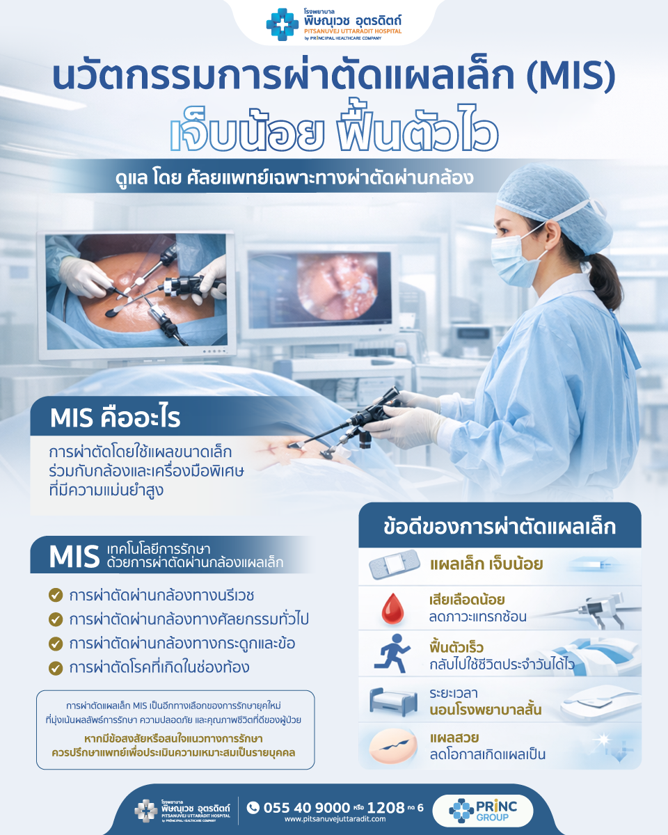 ขอแนะนำให้รู้จักกับ MIS (Minimally Invasive Surgery) หรือ "การผ่าตัดแผลเล็ก" นวัตกรรมการรักษาที่โรงพยาบาลพิษณุเวช อุตรดิตถ์ นำมาใช้เพื่อยกระดับคุณภาพชีวิตของผู้ป่วย ให้คุณกลับไปใช้ชีวิตปกติได้เร็วกว่าที่เคย