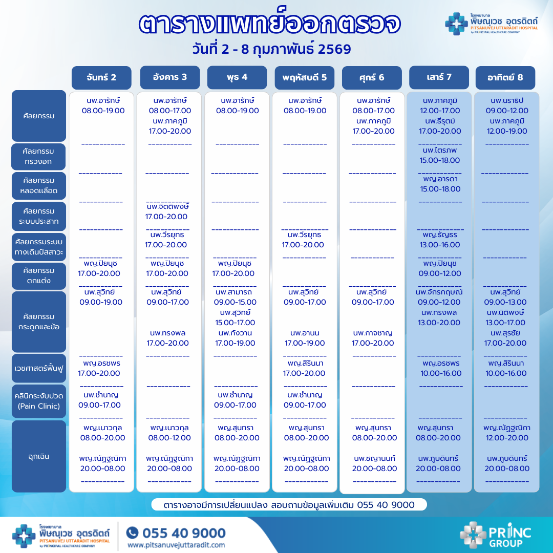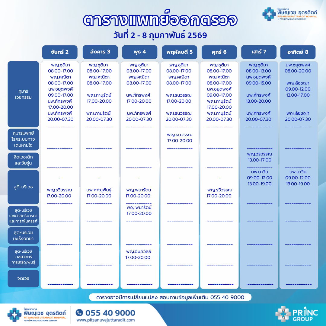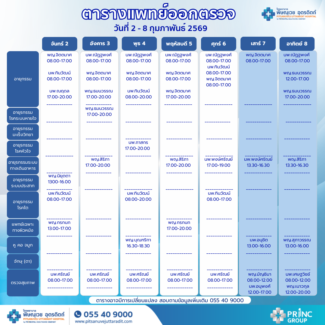 ตารางแพทย์ออกตรวจ โรงพยาบาลพิษณุเวช อุตรดิตถ์ ประจำวันที่ 2-8 กุมภาพันธ์ 2569