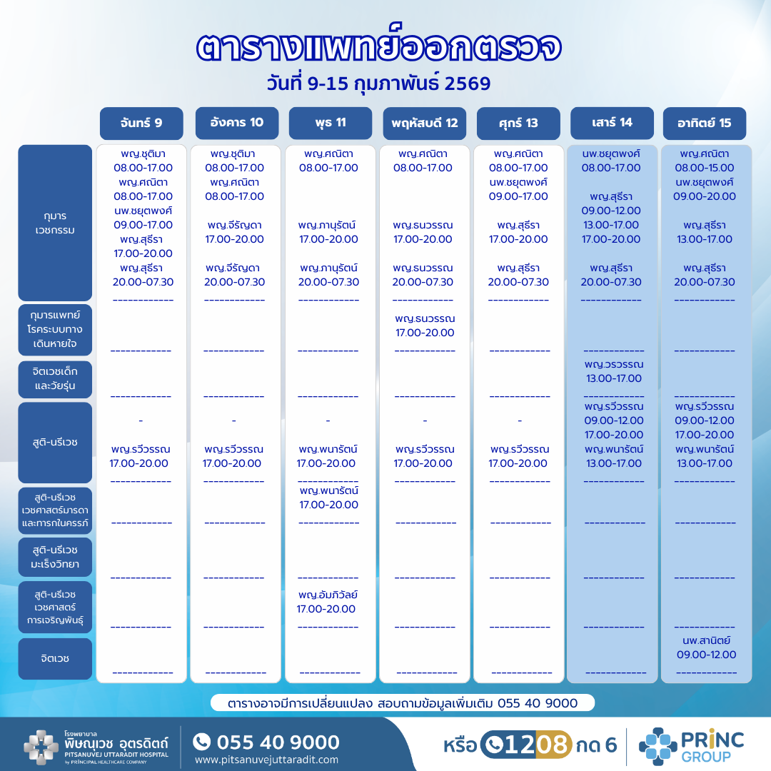 ตารางแพทย์ออกตรวจ โรงพยาบาลพิษณุเวช อุตรดิตถ์ ประจำวันที่ 9-15 กุมภาพันธ์ 2569